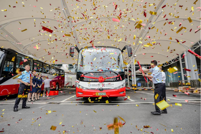 在首辆宇通高端新能源客车首发头车从深圳发车的同时,中山会场内早已准备就绪的宇通高端新能源领航头车也开启了同步始发之旅,在万众瞩目下,宇通高端新能源客车创下了线路通车首日即完成对向发车的纪录。