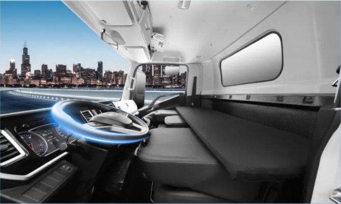 骏铃A9大金牛驾驶室采用2090mm行业领先超宽体设计,内宽达1850mm,并设置了长度超过1837mm的超级卧铺,1.8米身高成人可轻松躺平。车内设置超过160L的分布式储物空间,便于分门别类收纳随车物品与工具。宽敞布局缓解压抑感,并可选气囊减震座椅,提升长途驾驶舒适性。