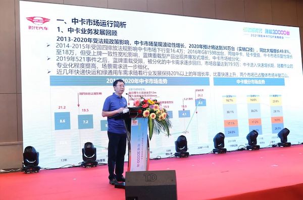 峰会上,时代事业部研发副总裁高新路就领航中卡产品战略进行解读:“时代汽车将法规一致性作为研发的主要方向,面对快速增长的中卡目标市场,时代研发团队将以50万台战略目标为指引,持续培育团队能力,确保能持续输出高竞争力、高品质、优质用户体验的中卡产品,与各合作伙伴一道共同服务客户、赢取未来,2021年中卡力争销售2万台。”
