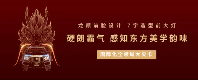 中国重汽皮卡定位为国际化全领域大皮卡。越野型皮卡车身尺寸5400*1965*1898mm,货箱尺寸1520*1520*530mm。整车造型硬朗霸气,前脸采用“龙颜”设计,7字型LED大灯宛如两条龙须,尽显东方美学韵味。
