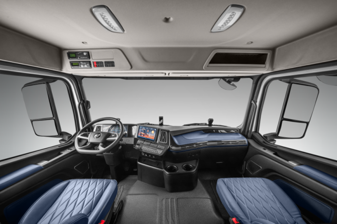 驾驶室内,中地板采用仅150mm的超低鼓包设计,方便驾驶员上下车。超大后视窗便于驾驶员观察货箱举升状态,操作更灵活。真皮质感座椅宽大舒适,支持前后、深坐、速降等多项调节功能,搭配三防用料的超宽卧铺,让驾驶员在工况操作或临时休息时都能获得舒适体验。车内中控大屏搭载货车导航、语音控制、智能天气、QQ音乐等丰富智能应用,增添工作乐趣,缓解驾驶疲劳,间接提升运输效率。
