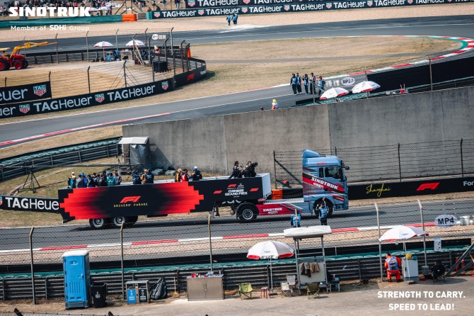 在备受瞩目的车手巡游环节,四辆身披赛道专属涂装的中国重汽重卡与国际最顶级的F1车手同框亮相,当巡游车队驶过赛道,镜头追逐、闪光灯交织,这一“力量与速度”同框的震撼画面,迅速定格为全球焦点。
