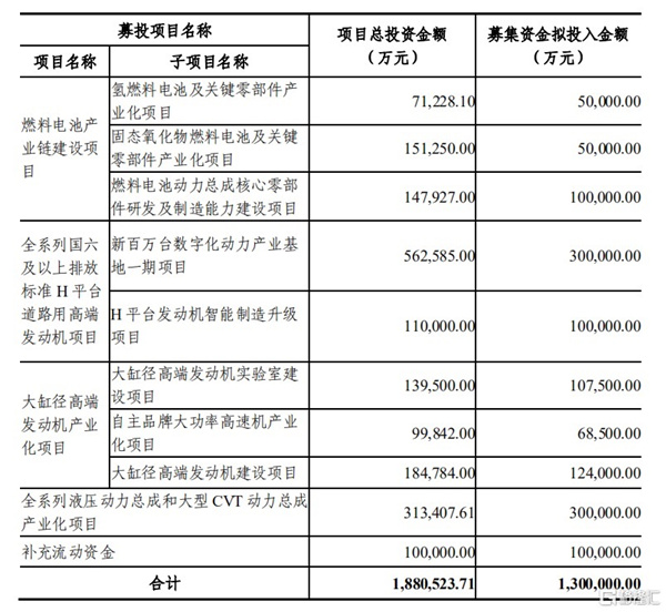 根据定增公告显示,主要募投项目涉及燃料电池、全系列液压总成和大型CVT、大缸径及H平台高端发动机等产业,意在推动业务全面升级。